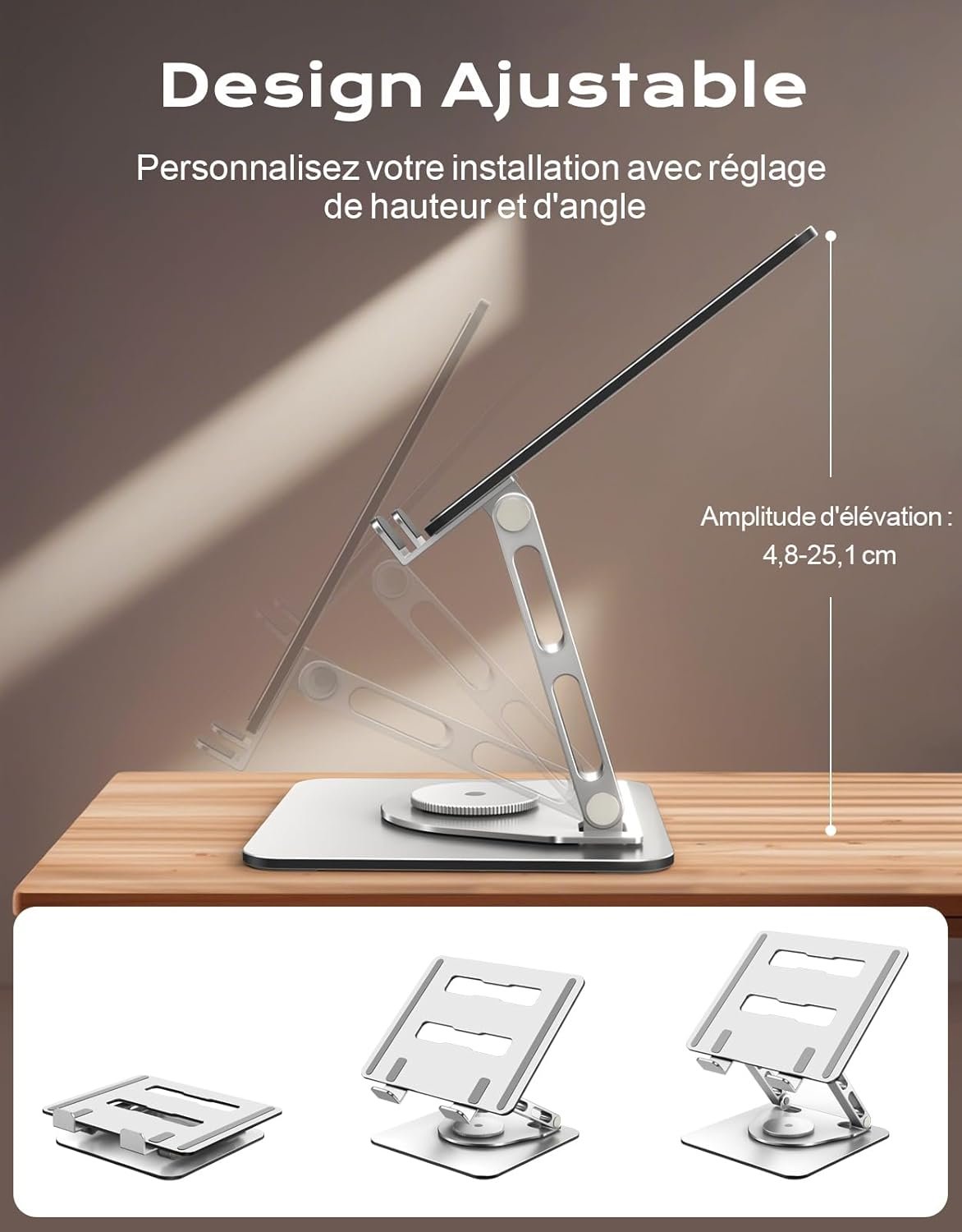 - 360° Rotation Fluide – Profitez d’une liberté de mouvement sans précédent avec Glangeh support ordinateur portable bureau ! Son socle pivotant à 360° offre un positionnement infini – idéal pour cuisiner, collaborer ou utiliser un second écran. Adaptez votre espace de travail au bureau, en réunion ou à la maison en un geste.